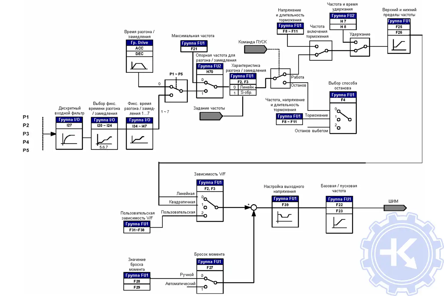 В некоторых частотниках существует пункт наличия/отсутствия фильтра в цепи питания двигателя. Этот пункт отвечает за подключение различных видов нагрузок, в том случае, когда возможно выбрать нормальное или инверсное изменение частоты при повышении уровня сигнала обратной связи.
