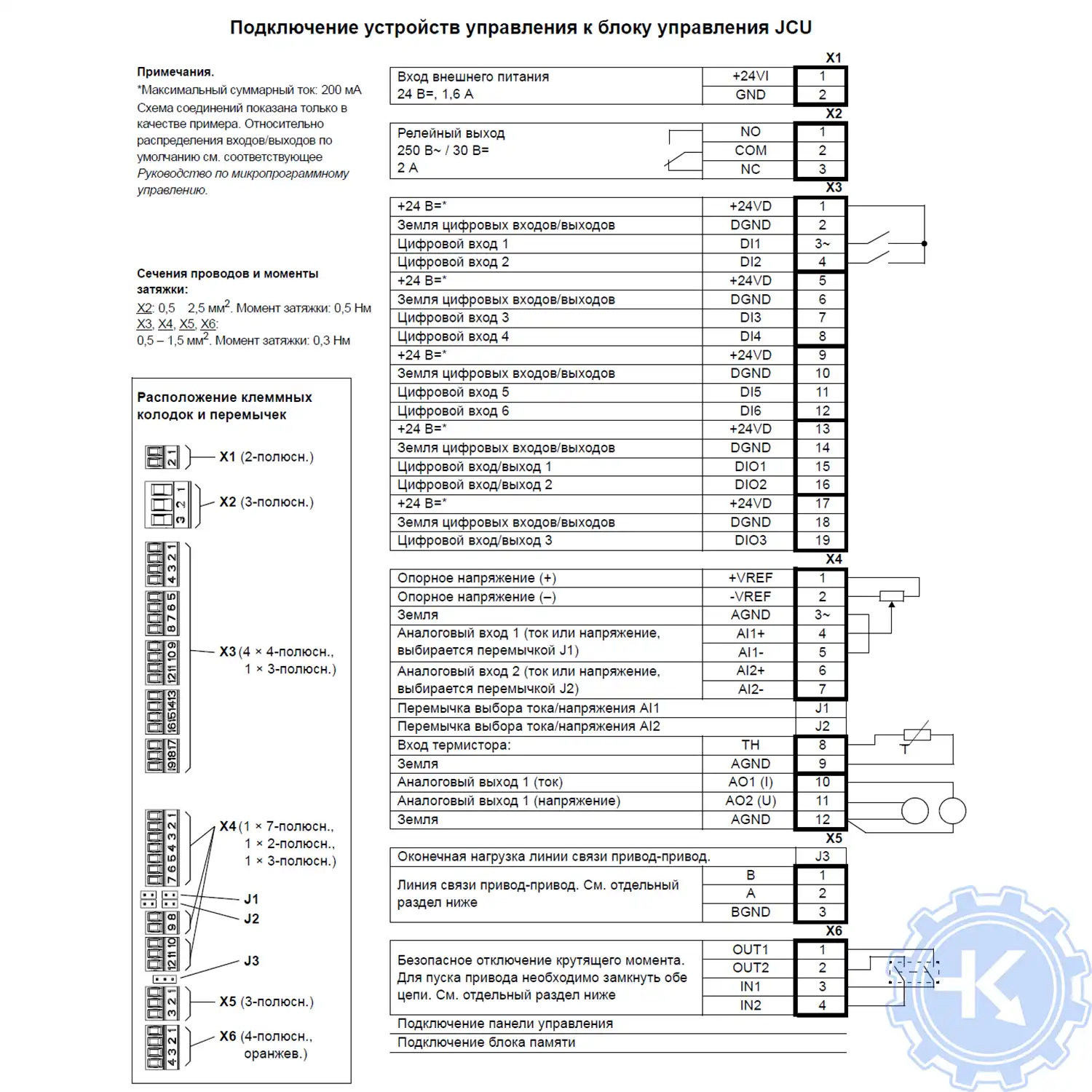 Схема подключения сервопривода ABB ACSM1-04, подключение устройств управления к блоку управления JCU. |