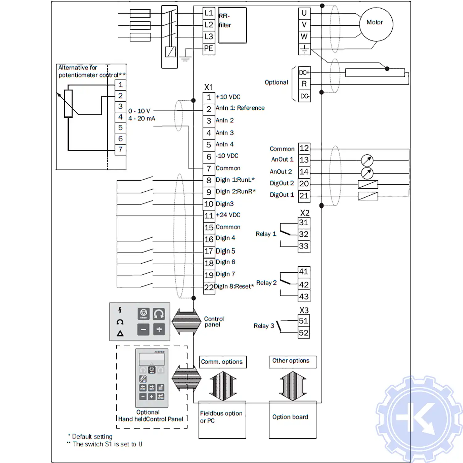 Схемы подключений частотных преобразователей Emotron могут отличатся друг от друга даже если эти преобразователи относятся ко одной линейке. Схема подключения преобразователя зависит от многих факторов таких как потребляемая частотным преобразователем нагрузка или питающая сеть к которой подключается частотник 200V – 380V и конечно же зависит от CPU в паре, с которым предполагается работа преобразователя.