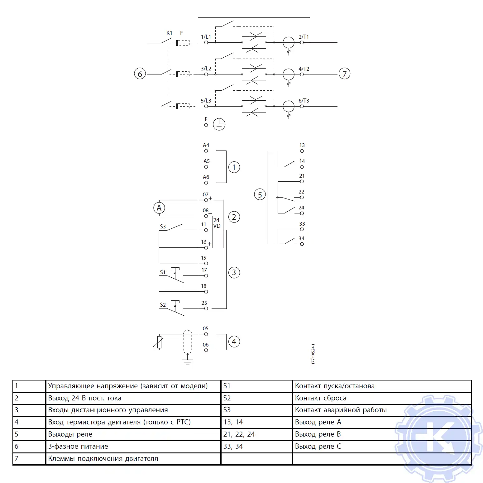 Starter/communication (Устройство плавного пуска/связь) (между модулем и устройством плавного пуска) |