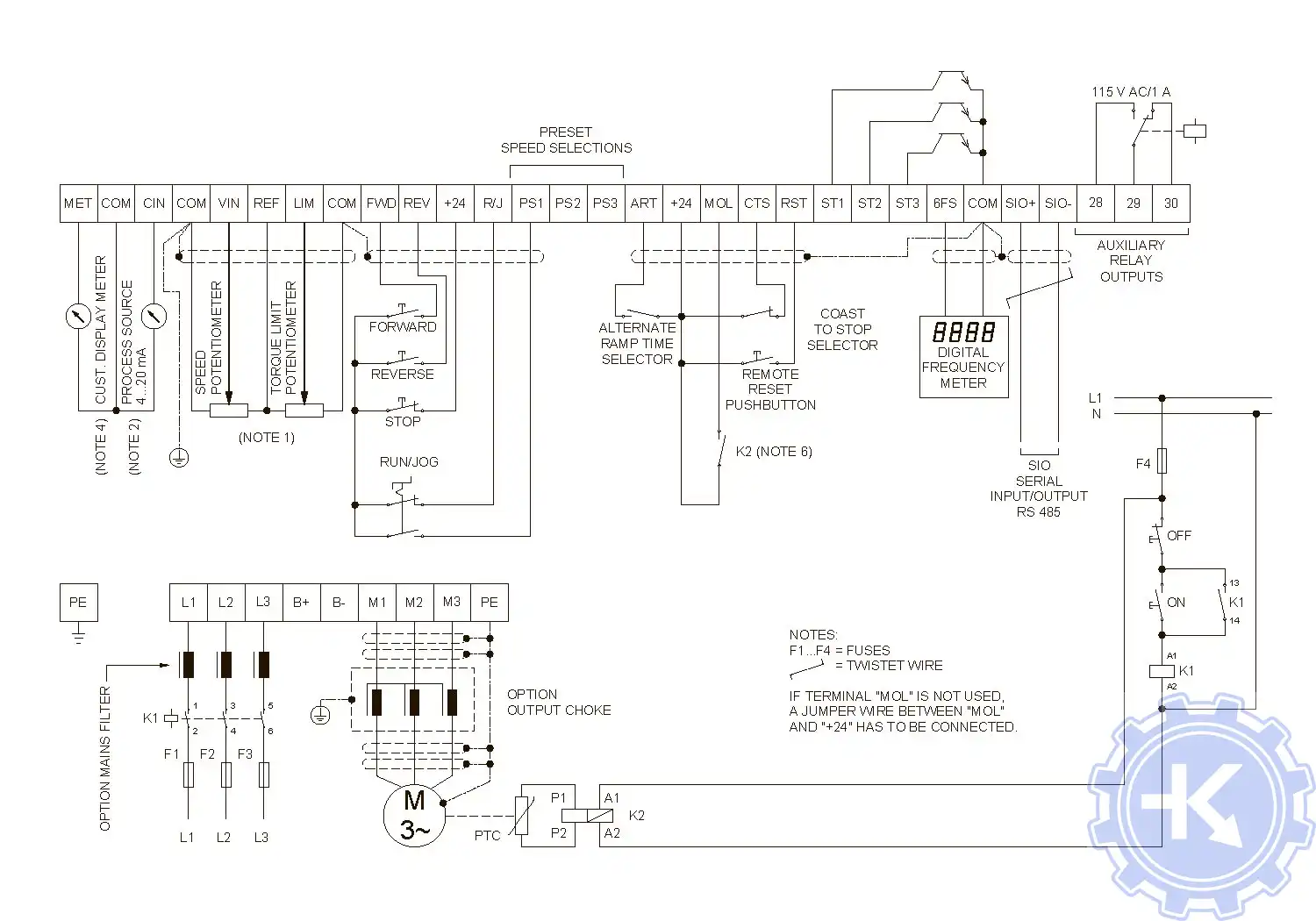 В некоторых частотниках существует пункт наличия/отсутствия фильтра в цепи питания двигателя. Этот пункт отвечает за подключение различных видов нагрузок, в том случае, когда возможно выбрать нормальное или инверсное изменение частоты при повышении уровня сигнала обратной связи.