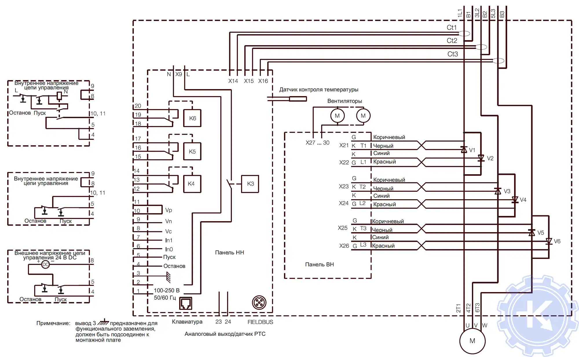 Схема подключения устройства плавного пуска, тип PSTB |