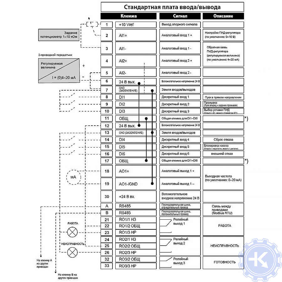 Ниже приведены схемы подключения частотного преобразователя VACON 100 с различными управляющими программами.