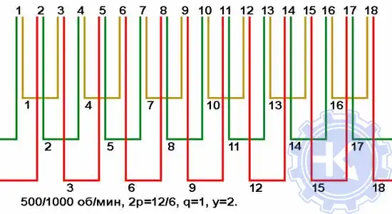 Схема укладки двухскоростной обмотки.( трёхфазных многоскоростных асинхронных электродвигателей) |