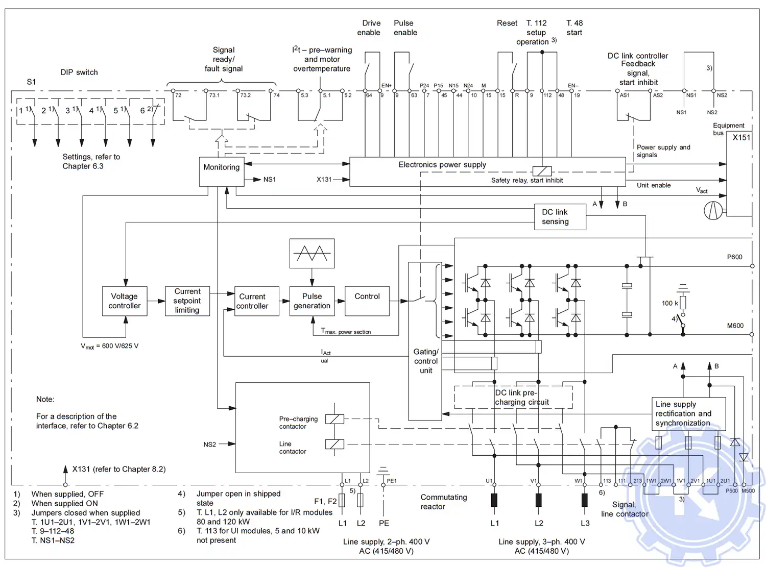 Блоки питания – рекуперации SIMODRIVE 611 имеют шести импульсную мостовую схему 3-х фазного тока. Совместимость обеспечивается чувствительными к любому току защитными устройствами FI, на сегодняшний день имеются устройства номиналом до 63A.