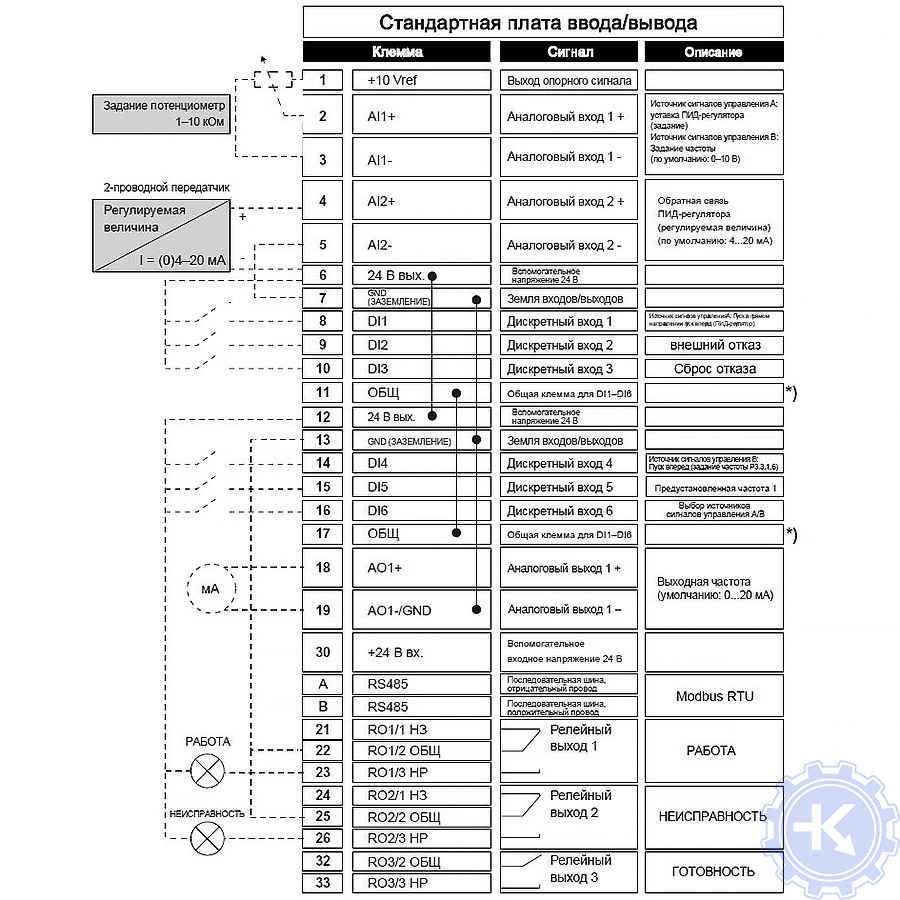 Ниже приведены схемы подключения частотного преобразователя VACON 100 с различными управляющими программами.