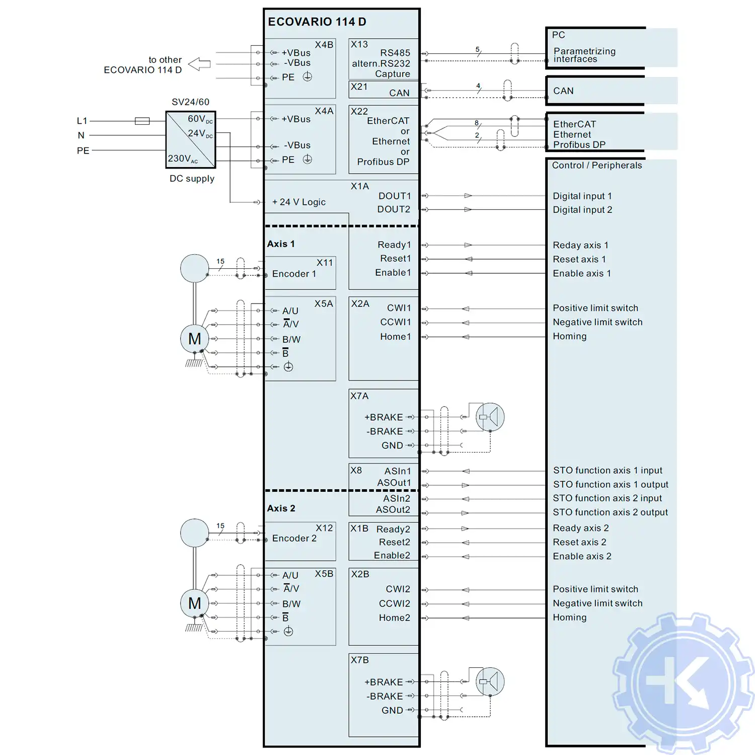 Соединение с внешними устройствами сервоприводов Ecovario 114D, конфигурация интерфейсов |